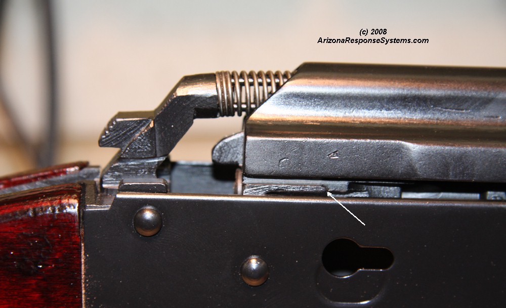 Because it is the most simple, the first thing I address is the angle of the bolt carrier rail. One thing I have learned about AKs is there is nothing random about it. If there is a minute machining operation, it is there for a good reason. While I may not always understand the reason, I have come to trust that there is one. Note in this image that there is a ramp on the leading edge of the bolt carrier rail. While it is on both sides, the right side is more critical because charging the rifle tends to not only pull the carrier back, but also up and toward centerline – perfect for jumping the rail. This is why a rifle that can be made to jump the rail on charging, may not do so in cycling, where there is no radial force.
