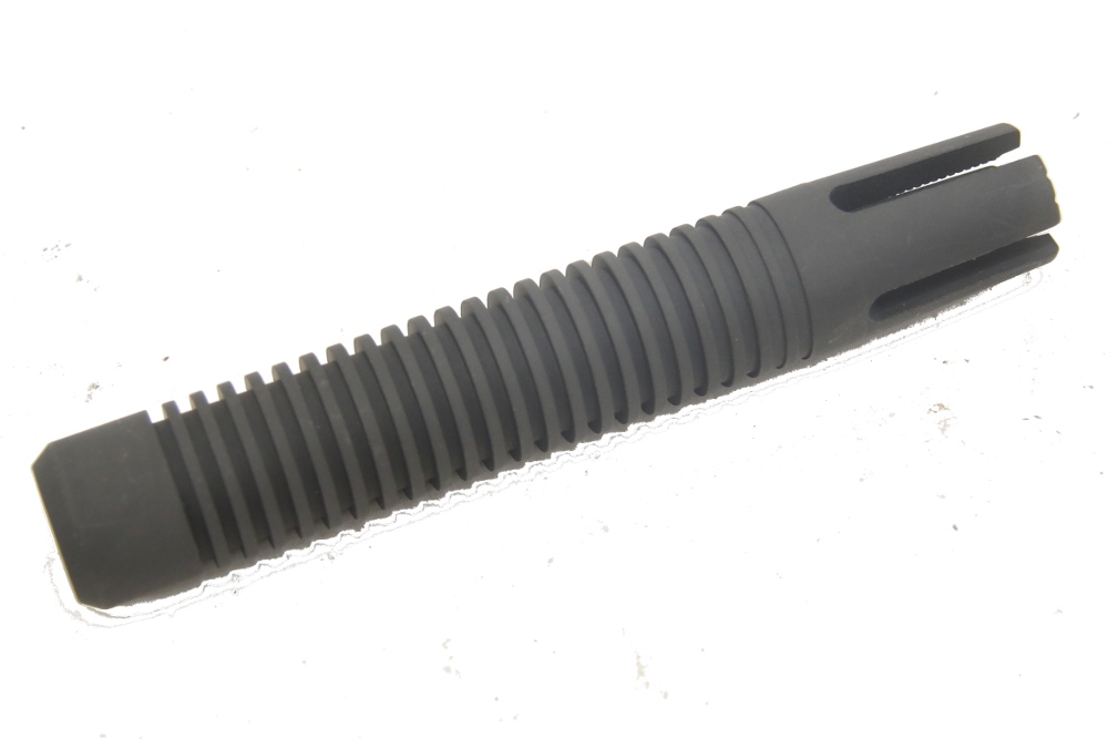 9/16-24 LH. US made 922 compliant FSE copy of Austrian “Stoll” flash hider incorporating 4-prong flash hider that functions as a wire cutter, and gas checks for rifle grenade. Sleeves barrel so will not fit on barrels shorter than 19″. Parkerized finish. Diameter increased from 22 to 22.5mm to deactivate grenade feature.