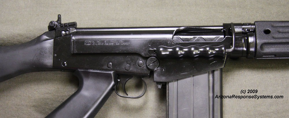 The model is C1-LAR-3. “LAR” is one of the many names for the FAL – “Light Automatic Rifle” and “3” means this is a type III receiver. The manufacturer markings are small and positioned to allow Type I or Type II lightening cuts as a possible future option.