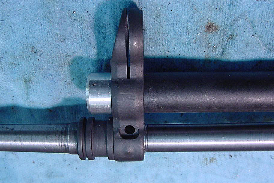 This is a critical fit. the gap between the cocking handle extension and the front of the bolt carrier, with the bolt carrier closed and locked, must be no more than .022″ – the thickness of a box cutter blade. the minimum gap is slight contact, as long as the cocking handle can still wiggle. If the gap is too large, pulling the handle out will not unlock the rollers.